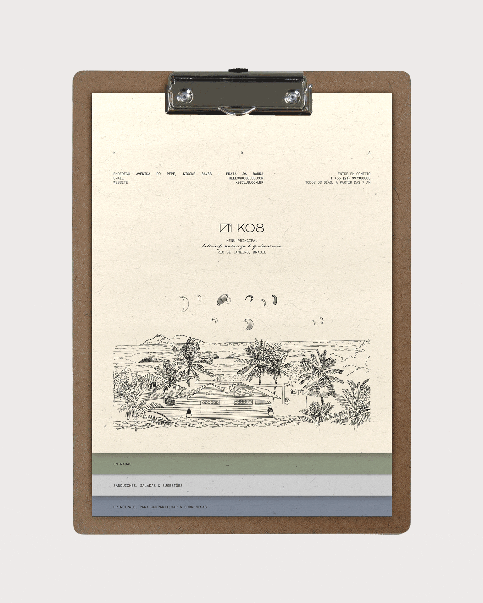 K08 began as a family kiosk, just the eighth on Rio’s shoreline. Over time, it grew into a club, a sport community, and now a kite-surfing resort in Galinhos. We designed a new brand identity for both the Club and the Bungalows, keeping the warmth of the original while introducing precision and structure. The logo fuses K, 0, and 8 into a single architectural form, supported by a calm colour system that differentiates each space. We extended the identity across physical touchpoints, from uniforms to signage, allowing it to live naturally in the environment. We also designed and developed a Shopify website that brings both experiences together under one digital roof.